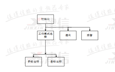 開機后,首先進(jìn)行程序的初始化。初始化完成后同時調(diào)用工作模式選擇、報警和PLC與變頻器之間的通訊程序。工作模式中,包含手動出標(biāo)、自動出標(biāo)兩種狀態(tài)。報警程序用于對機器狀態(tài)進(jìn)行實時監(jiān)控,并根據(jù)故障情況執(zhí)行相關(guān)動作。
